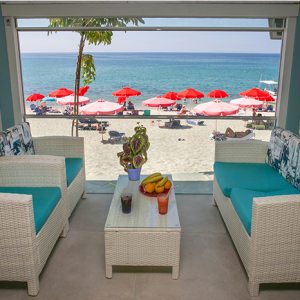 Facing the beach, with a view of the sparkling white sand and the endless blue sea, you can find our restaurant, which for 45 years, has offered excellent quality home-made food. In our restaurant, we offer freshly prepared Greek specialties. Enjoy the fantastic view of the sea while sipping a glass of wine and watching a wonderful sunset. We also have a café-bar, where you can spend your time relaxing, reading or just day-dreaming.